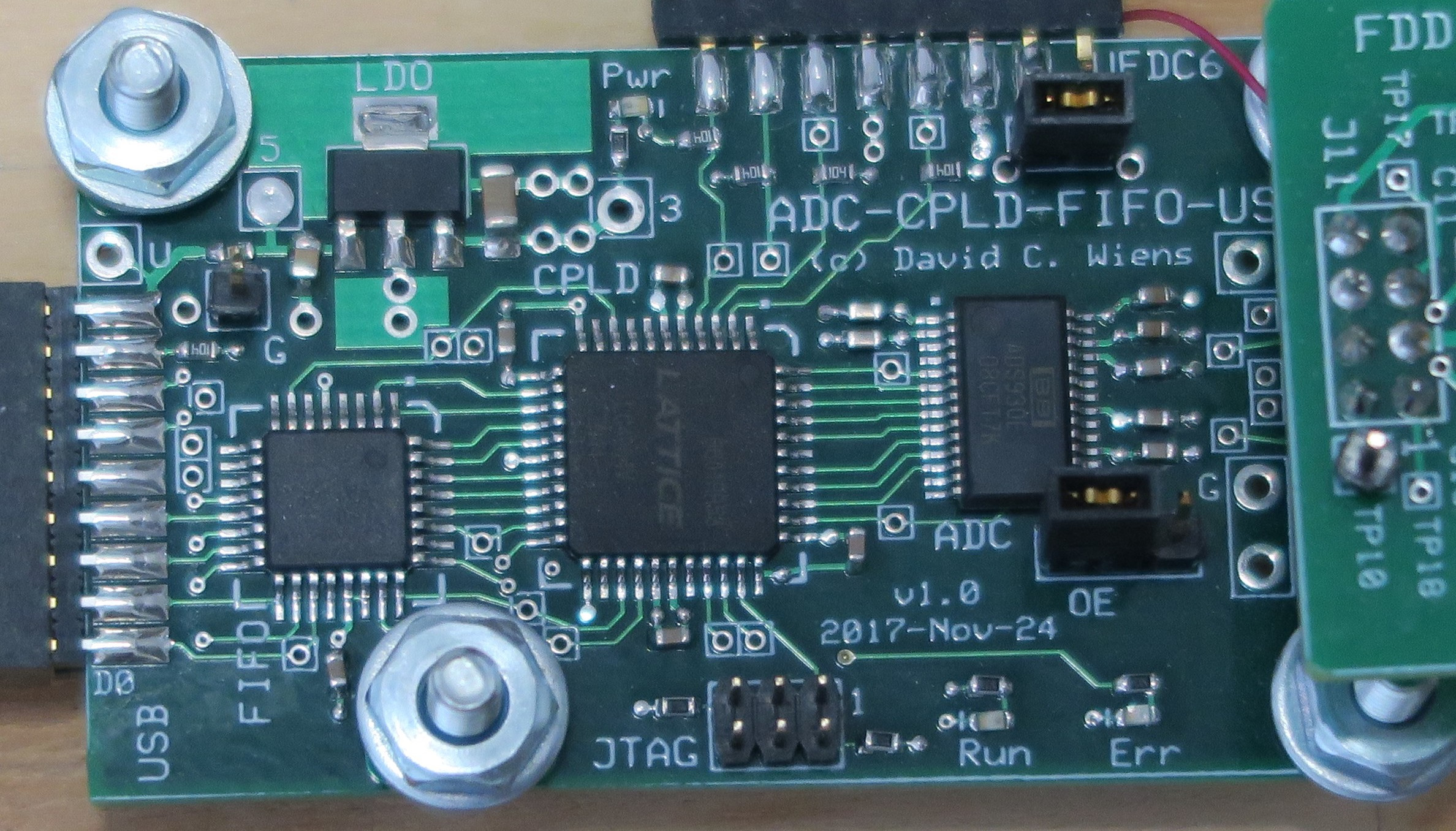 In January 2016 I started designing a device to capture the raw flux signals from a floppy disk drive, in order to image my hundreds of old floppy disks. The final design, which I called the Universal Floppy Disk Reader (UFDR), used a TI ADS930 8-bit pipelined ADC to capture the analog waveform, and a Lattice ispMACH 4064V 44-pin CPLD to capture the digital read signal from the drive, and to merge 8 analog and 8 digital samples (all taken at 15 MS/s) into one 10-byte packet. These packets were written into an IDT 72V241L 4Kx9 synchronous FIFO, which in turn sent them to the host PC via an FTDI FT232H USB-FIFO using its synchronous 245 parallel FIFO mode. The logic equations were written in ABEL and processed with the ispLEVER Classic CPLD design software.
