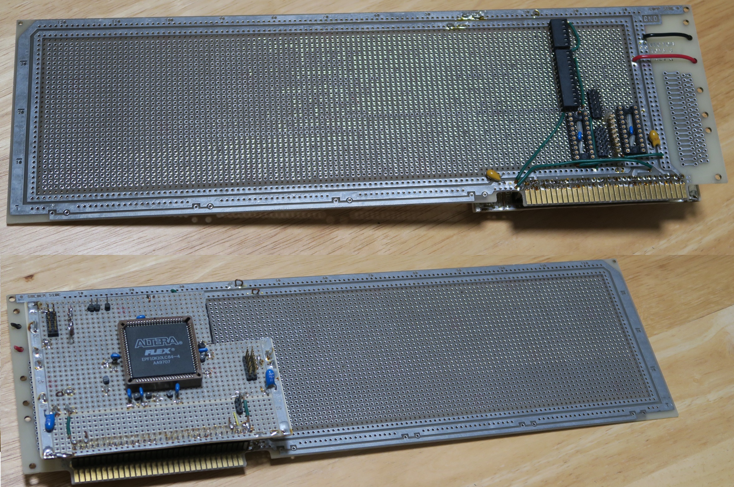 I planned to use the FLEX 10K10 (with 576 logic elements, in a PLCC-84 package) to implement at least two projects. The chip was placed on an 8-bit ISA bus prototyping board -- see picture. But my notes seem to indicate I didn't plug the board into the ISA bus, but kept it outside the PC chassis for easier access, powered from a spare disk drive power cable. Instead of building a clone of the Altera ByteBlaster programmer that plugs into a PC's parallel printer port, my notes say that I connected the parallel port pins directly to the FLEX 10K10 pins, and that I wrote my own software in Turbo C that sent the binary file to the device to configure it.